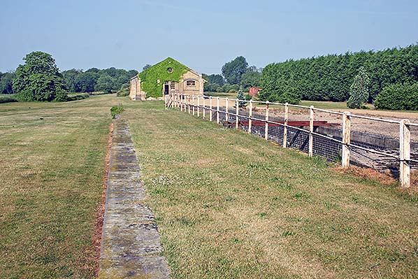 [Source: Darren Kitson] ![]() The east end of the Mildenhall platform looking north-west in June 2006. The goods dock is seen behind the fence.