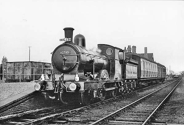 [Source: Darren Kitson] ![]() Mildenhall on 28 November 1959. The occasion is a Cambridge University Railway Club special using the very last 2-4-0 locomotive to run on mainland Britain's national network; Class E4 No.62785. Looking spruced-up and carrying an express headcode with equally spruced-up lamps, she was withdrawn from service immediately afterwards (officially w/e 30 November 1959) to enter preservation albeit not with a tender cab. The train comprises a Gresley composite in 'Blood & Custard' and a Gresley brake third in either that dreadful imitation teak livery (doubtful by 1959) or BR maroon. There are ways of telling, even with a black and white image, but on this occasion the carriage is too far from the camera and at the wrong angle. 'Blood & Custard' was BR's first coaching stock livery and it went by various names, some derogatory and some not. The livery suited pre-nationalisation stock, especially the Gresleys, but did not sit so well on the tidier lines of BR MkI stock.