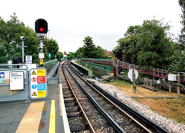 Looking east from the east end of Mill Hill East station in July 2012. The steel girder bridge was built during work to extend the Northern Line to Edgware. It did have a second track for a short time in the late 1930s but this had been removed by the time the station reopened in 1941.