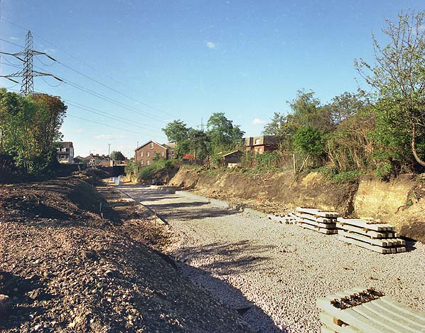 The new Mitcham tram stop under construction in October 1998. the tram stop is sited at the east end of the former Mitcham Station