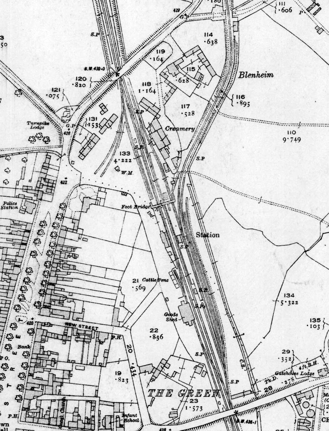 The 1922 25" map reveals the two mileage sidings on the site of the former tramway wharf has been installed, branching off the siding into the north end dock, along with a weighing machine (131, 133). The peculiar siding just north of the station and trailing on the Up side is now connected to the creamery siding (to the right of 133) while the creamery buildings have been extended. The Railway Hotel (P.H.) stands at the end of New Street, now New Road. It ceased trading in 1967 but the building still exists and in 2024 the painted "Railway Hotel" name could still be discerned on the building's east wall. The railway cottages were also on New street and are still in existence, now holiday lets.
