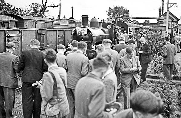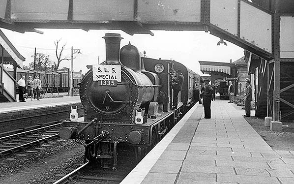 Photo by HC Casserley ![]() The Stephenson Locomotive Society's Shipston Branch Tour of the 31st of August 1952 waits at Moreton-in-Marsh while the locomotive takes on water; tour participants, in typical attire of the time, adjust their cameras and generally peruse the proceedings. The locomotive, 2-4-0 No. 1335, was one of a class of three built by Dübs & Co. in 1894 for the Midland & South Western Junction Railway, becoming that companies Nos. 10, 11 and 12. On takeover by the GWR they became Nos. 1334 - 6 and all survived into British Railways ownership. No. 1335 had been placed into store at Swindon but was steamed again for the SLS railtour. She was withdrawn the following month along with No. 1334, while the survivor, No. 1336, lasted until March 1954. The railtour train comprised four ex-GWR Collett coaches. Sharp-eyed readers may notice the mineral wagon adjacent to the locomotive is numbered MoT 36713. In 1939 the Ministry of Transport requisitioned good wagons imperative for the war effort and numbered them with MoT prefixes. Many remaining so-prefixed for many years following the war as in this instance. The Ministry of Transport became The Ministry of War Transport in 1941, reverting to Ministry of Transport in 1946. A number of other changes to title followed over the years and today it is the Department for Transport but the MoT initials linger on with the MoT Test for road motor vehicles. When cattle wagons still existed they were sometimes used, cleaned of course, for the transport of fruit and vegetables. When used thus they were covered with a tarpaulin to keep inclement weather at bay. Why the ventilated van trying to hide behind the locomotive is covered by a tarpaulin is, however, a mystery.