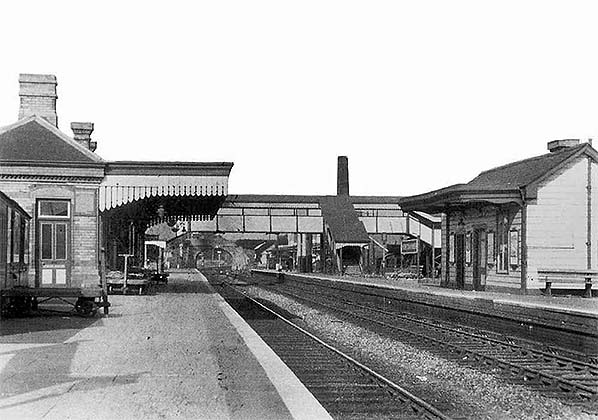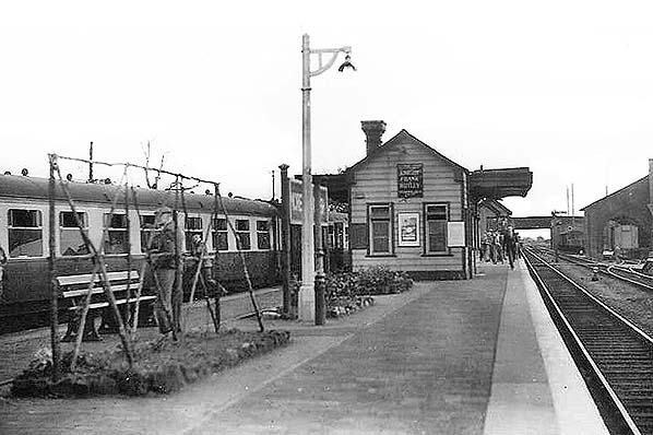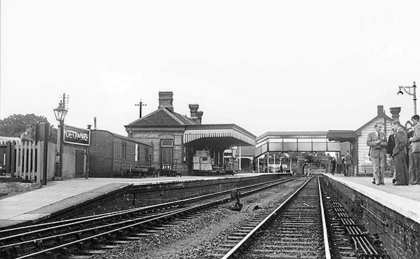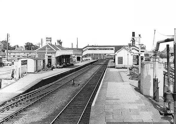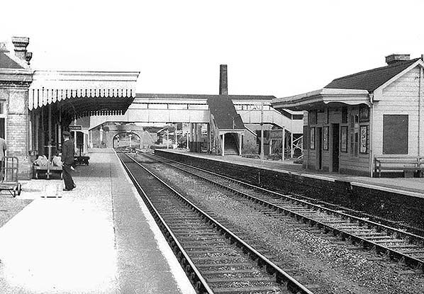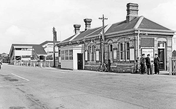 Photo from Eric Gates collection ![]() The station forecourt and building sometime in the British Railways period and facing north-east. It would appear the entrance previously had a canopy which was subsequently enclosed. Today the enclosure has gone but a rather crude canopy, which is not that seen here, provides some shelter. The building is now minus chimney stacks but is otherwise little altered. Today a cycle rack stands at far right, a ticket machine stands to the right of the entrance and of course the modern footbridge has replaced that seen here.