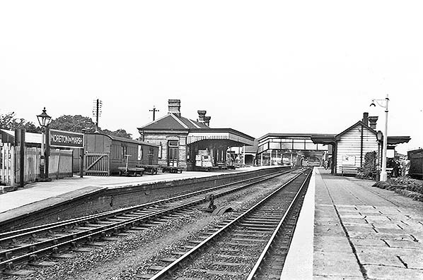 ![]() Looking north from the Down platform in October 1951. The grounded body of a Full Brake is partially visible at extreme left. In the 1930s a corrugated iron hut had stood on this spot but by British Railways days the grounded body had appeared. The Up side wooden waiting room stands on the right; in typical island platform style it was double sided as until 1929 it also served waiting passengers, if any, for the Shipston-on-Stour branch.