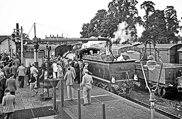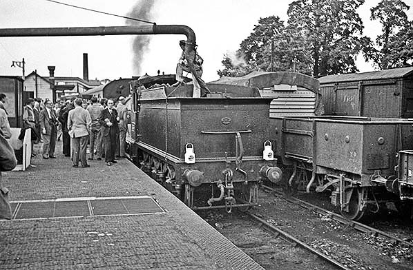 Photo by Geoffrey Head ![]() The SLS railtour has returned, locomotive tender first, to Moreton following its trip along the Shipston-on-Stour branch. Quite why it was necessary to top up the water tank, it having been done on the outward journey, is not clear but one might assume there was problem with leaks. Some four and half years after Nationalisation, the locomotive's tender still bears the GWR initials. Even in 1952 it was not uncommon on all regions of BR to see extant lettering of the relevant Pre-Nationalisation company, albeit mainly on the less important classes of locomotive. In the left background an electric lamp on a precast concrete post is visible while on the left a gas lamp, apparently complete, is still in situ. Note the fencing down the centre of the platform, the branch side having long since gone out of regular passenger use. A brazier is also present, its purpose being to prevent freezing of the water crane but it is unlikely to have been needed during August.