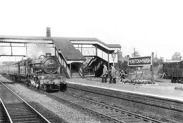 Photo from Jim Lake collection ![]() In October 1951 Castle Class 4-6-0 No. 5063 ‘Earl Baldwin’ arrives with an Up passenger train. This locomotive began life in June 1937 as Thornbury Castle but was renamed the following month. She was one of a batch, nos. 5043 - 5063, to be renamed from Castles to Earls and the Thornbury Castle name was to reappear on BR-built No. 7027 in 1949. No. 7027 was destined to survive the famous Barry Scrapyard but at the time of writing was unrestored and it appears she will become a parts donor for other projects. No. 5063 on the other hand was withdrawn in February 1965 and did not escape the scrap man who in this case was John Cashmore Ltd. at their Great Bridge yard at Tipton, near Dudley. The frame visible on the smokebox of No. 5063 held a three-digit train identification system introduced in 1934 predominantly to aid identification of the summer express passenger trains to/from the West Country. The system survived well into the British Railways period and could also be seen on certain early examples of the Western Region's diesel-hydraulic locomotives. Back at Moreton-in-Marsh, beneath the footbridge can be seen the mysterious object resembling a Wickham trolley. At far right an elderly four-wheel carriage is in use as what appears to be a mess van.