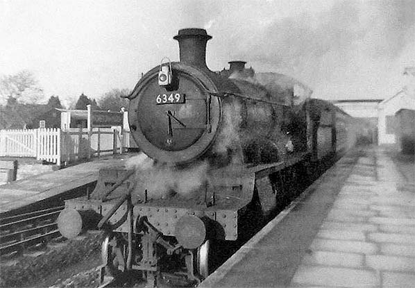 Photo from John Mann collection ![]() On an apparently miserable winter day ex GWR 4300 Class Mogul No. 6349 pauses at Moreton-in-Marsh with an Up local service. She appears to be carrying an 84F shed plate (Stourbridge Junction) which would date this photograph to the period between November 1957 and December 1960. Certainly it is no earlier than June 1957 as she is fitted with outside steam pipes, this modification occurring at that time. Withdrawal came in August 1964 and she did not escape the scrap man.