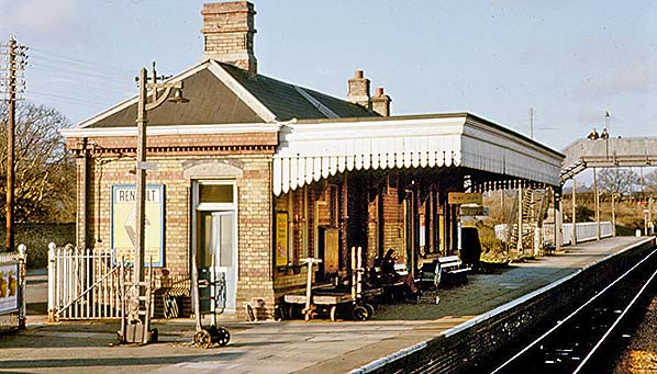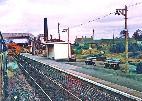 Photo by Alan Young ![]() The main station building seen here from an Up train in January 1974. While Moreton-in-Marsh is known to have been given BR 'totem' nameplates, what appears to be present here are lamp tablets or perhaps an early form of BR corporate signage. Looking at the lamp post on the left, these plates are not what one might call obvious. The (then) usual collection of platform barrows can be seen while beneath the canopy awaits a young lady with perambulator. Adjacent to the onlookers on the footbridge, a gas lamp appears to be still in use despite the platforms now being electrically illuminated.