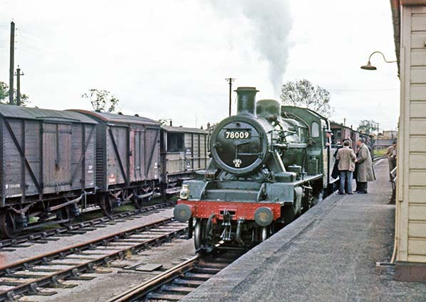 7 June 1958 - May 1978 ![]() On the 7th of June 1958 a brake van tour organised by The Railway Club took a trip along the Shipston-on-Stour branch. Here it is seen at Moreton-in-Marsh prior to departing along the branch. The points ahead of the locomotive are set for the branch. The tour started from and ended at Paddington; it covered a number of other lines but whether the train of five brake vans ran from/to Paddington is not known. More likely, is tour participants using service trains, with the brake vans being provided only for the Shipston and Chipping Norton branches; tour tickets were marked 'Special Arrangement' which might suggest this was the case. The locomotive, BR Standard Class 2 2-6-0 No. 78009 appears to have had a quick spruce-up for the occasion. She was a Worcester locomotive at the time and indeed spent ten years of her short life of a little under eleven years at that shed. Withdrawn in 1964 she was not among the few class members to survive into preservation.