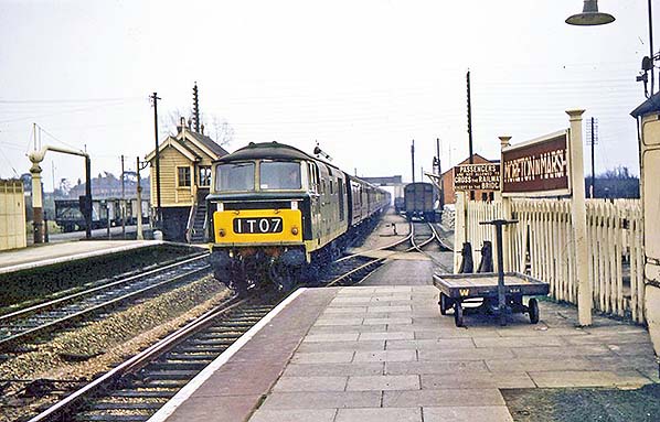 Photo received from Doug Parish ![]() In March 1964, Beyer-Peacock (Hymek) Type 3 diesel-hydraulic No. D7058 arrives at Moreton-in-Marsh with a lengthy Down passenger train. In the right background the original goods shed has gone and its new, smaller replacement is in use. At extreme right a grounded carriage body can just be seen. At some point in time during BR days this had replaced a corrugated iron hut, presumably used as a lamp room, which had been all-but hidden from view by the previous and larger running-in board which stood where the unpaved platform surface can be seen. The running-in board, it will be noticed, is in three horizontal sections of which the lower two do not fully align. On the left, the water crane and cast iron urinal have received a repaint; the water crane with a larger area of cream and the urinal apparently all-over cream. Locomotive D7058 in due course became a member of the 101-strong Class 35. 'Beyer-Peacock (Hymek)' was a consortium of companies, the 'Hymek' name being derived from Hydraulic and Mekydro. The Hymeks were relatively small and neat, but perhaps a little overstyled, machines. They had their problems, among which was a tendency to overheat, but when working well they worked well and are often regarded as the best of the BR main line diesel-hydraulic types. No. D7058 is seen here in its original livery but the arrival of blue livery saw a number of variations. All BR's diesel-hydraulic main line locomotives fell victim to being deemed 'non standard'. There were also fleets of diesel-hydraulic multiple-units and shunting locomotives, both of which were not confined to the Western Region. Despite BR wanting rid of all diesel-hydraulic forms of traction, it nevertheless soon reappeared on the next generation of diesel multiple-units, the Pacers, Sprinters etc. The Hymeks were the penultimate type of diesel-hydraulic locomotive to survive in revenue service, the last being the Class 52 'Westerns', with the final examples bowing out in 1975. Four examples made it into preservation but D7058 was not among them.
