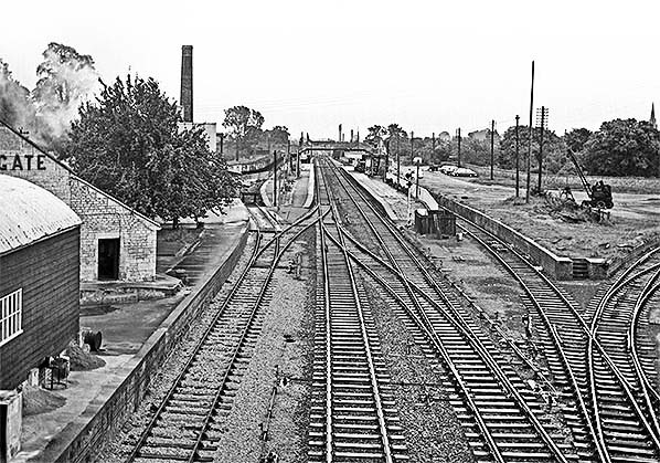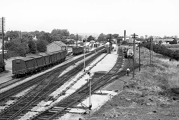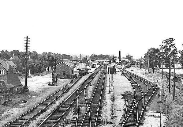 Photo from DK Jones collection ![]() The beginning of the decline at Moreton-in-Marsh in July 1967, seen from London Road bridge. Several sidings have been lifted and Moreton's large goods shed has disappeared but the yard crane, for now, survives. The small and then quite new goods shed to the left would appear to be in use by a coal merchant if the open wagons and elevator are reliable indications. The signal box is partly obscured by the signal backboard, a device used to aid sighting. The Shipston branch finally closed in 1960 but its track, curving to the right behind the creamery, was retained for use as an engineer’s siding and this short, truncated section is perhaps what we are seeing here.