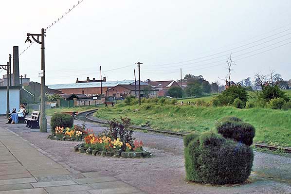 Copyeigh photo from Colour Rail ![]() Looking south from the road bridge in September 1966, when the only real hint of something resembling modernity was the running lines now laid with flat bottom rails at this end of the station. On the left, the creamery shows evidence of its Unigate ownership and close observation reveals that the through road through the east face (left) of the island platform had been severed and a buffer stop positioned adjacent to the platform ramp. Any rail traffic for the creamery which remained by this time would need to be reversed onto the siding from the Up Main line but it is possible rail traffic had ceased by this time. The sidings going off to the right were the mileage sidings on the site of the former tramway wharf. These sidings were latterly used for coal traffic and were to remain in situ for many more years. The crane on the right appears to be engaged in the demolition of a hut which had stood adjacent.