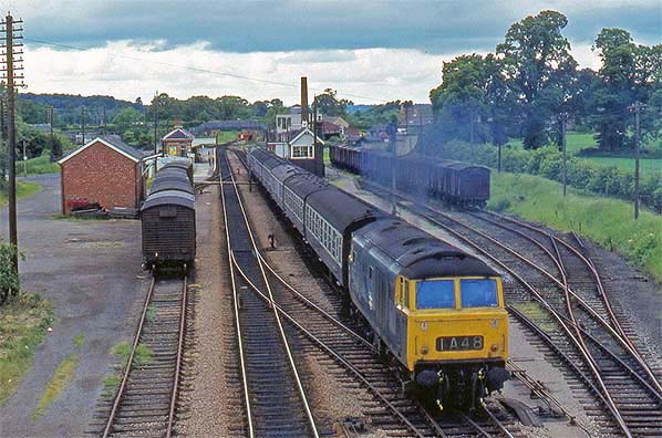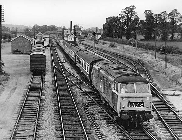 Photo from Martin Prossor ![]() On the 9th of June 1973 an unidentified Class 35 'Hymek' B-B diesel hydraulic departs for Paddington. The then single track section towards Evesham is visible in the background and the Hymek has now joined the double track section to Ascott-under-Wychwood. A rake of vans probably for fruit traffic, stands on the goods shed road while another rake sits in the Up sidings to the right. At this time these sidings were sometimes used as holding sidings with vans transferred over to the goods shed road as required. There was another siding on the right, but this time long since lifted, leaving just the points in situ and there appears to be a short length of rail lying on the right hand rail presumably to act as a crude stop device. The remains of yet another siding can be seen immediately right of the locomotive; it used to run up to the end of the platform and is visible in one of the aerial views. Presumably this siding was removed to make way for the signal to the right of the train. The Hymeks were a familiar sight on this line, working Paddington to Worcester and Hereford trains. They were neat and fairly dependable machines although their styling did not entirely suit their relatively short length. The 101-strong class was introduced in 1961 but fell victim to line closures, service reductions and the BR determination to get rid of 'non standard' types which included the diesel hydraulics. The latter did not, however, prevent BR opting for hydraulic transmission for its second generation DMUs. The last of the Hymeks bowed out in 1975 and four have survived into preservation.