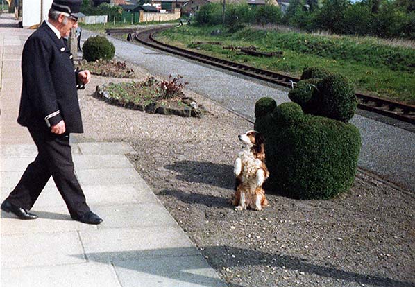 Photo from John Mann collection ![]() Station Inspector Geoff Cresswell with Lassie and bespectacled bush. It is not clear who is imitating who! The date is unknown although it is sometime after 1967 as the uninviting prefabricated waiting room installed that year is present. At the platform, the former track of the Shipston-on-Stour branch now ends at a buffer stop adjacent to the platform. Above the buffer stop and in the background a siding once branched off to serve a foundry, the site of which came to be occupied by the creamery. This siding continued to exist after the creamery was established but had disappeared by 1919. The other track seen here was also a siding which once continued almost to Todenham Road but was by now truncated just around the curve.