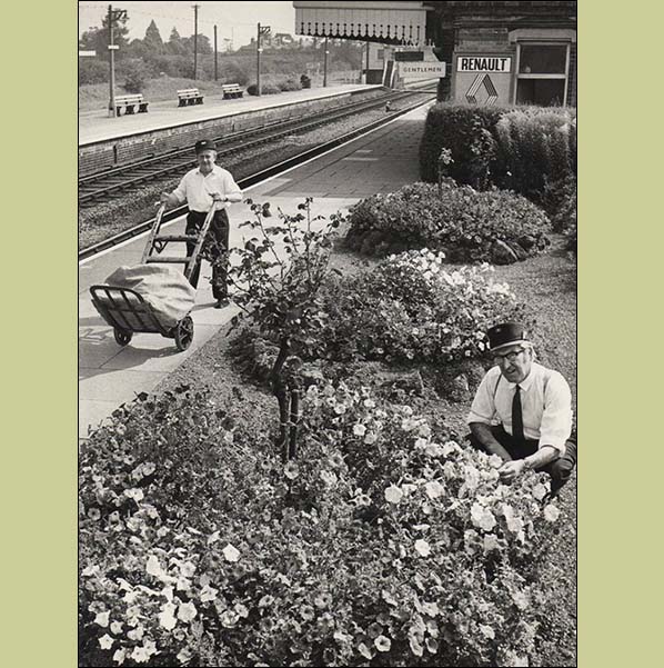 Photo from Susan Cresswell ![]() Station Inspector Geoff Cresswell is seen here tending the station gardens, or perhaps merely posing among them for the camera. Staff at many stations took great pride in their gardens and there were annual 'best' competitions. In those days staff had the time and in part because there were often plenty of them would also devote some of their off duty time. Today floral displays at stations away from the big cities tend to be left to volunteer 'Friends of' groups of local people. One wonders to where the porter is going with his barrow, having walked past or come from the station building. This was the time of the BR 'black on white' corporate livery for signage but the Renault advertisement appears to have been positioned where few people would actually see it, perhaps because in the 1960s and later, the 'Buy British' approach was still prevalent albeit to a lesser degree than previously. Over on the island platform all bench seats face the main line, any need for seats facing the Shipston-on-Stour platform having long since vanished.