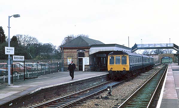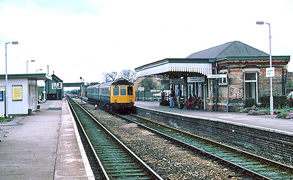 Photo by Alan Young ![]() On Sunday the 16th of June 1985, Class 117 DMU set no. L419 rasps away from Moreton-on-Marsh with the 2A81 15:55 Worcester Shrub Hill to Oxford service. At this time L419 would have been formed Driving Motor Second W51398 + Trailer Lavatory Composite W59508 + Driving Motor Brake Second W51356 with car W51398 being nearest the camera. Class 117 is best remembered for Paddington suburban services with the 'L' of the set number representing 'London district' but as this photograph shows they operated well beyond the London area and this was true of most DMUs allocated to a certain area or depot. As built, Class 117 had no gangways between cars but these were added later allowing all passengers to access the lavatories of which there were two. All three vehicles of set L419 have survived in preservation albeit dispersed. Of the passengers who have alighted, most are exiting the station via the footbridge but two or three ladies appear to be heading for the barrow crossing. Other people are sitting on a platform bench as if waiting for another train but there will not be another Up train for quite some time. The signal box appears to have either had new windows fitted or existing frames repainted. In due course it would receive such exotica as double-glazed windows which rather disfigured its appearance.