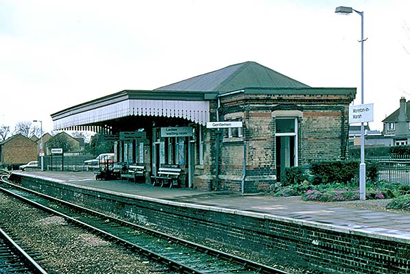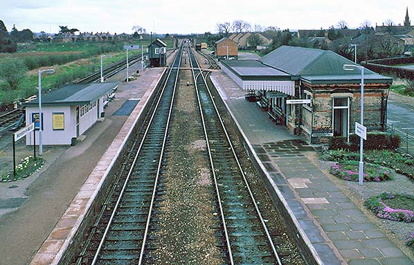 Photo by Alan Young ![]() The north, Gentlemen's lavatory, end of the station building in May 1986 and viewed from the Up platform. While one might expect a main station building to be on an Up platform this was not always the case. Rather, main buildings were placed on the platform nearest to the centre of the town, village, or in some cases the city that the station served. On the platform it would appear some effort was still being made to maintain the flower beds though a general air of shabbiness is beginning to set in. Beneath the canopy is a GWR type bench seat while a little further along is another bench with heavy wooden feet which was probably once inside the waiting room. The eviction of such benches from waiting rooms on to platforms was not uncommon. At extreme left can just be seen that the connection to the goods shed road is still in situ. Some years later it was disconnected at this end and in due course the siding was lifted.