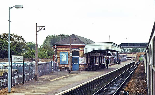 Photo by Alan Young ![]() Moreton-in-Marsh station looking south from the station footbridge in May 1986. The engineers siding running through the Shipston-on-Stour platform is still in place. The main station building on the up platform survives, largely unaltered but the waiting room on the down platform has been replaced by a modern building.