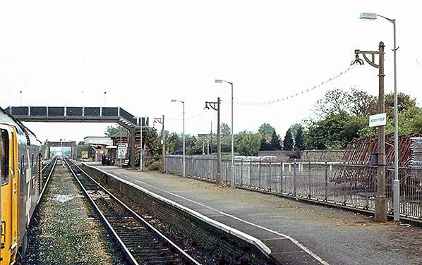 Photo by Alan Young ![]() A view of the Down platform from an Up train in June 1983. New electric lights have been installed ready to replace the concrete type products of the Taunton Concrete Works of the GWR and BR(W). The cable suspended between the concrete posts carried the electricity supply. This was quite common practice and was a quick and cheap alternative to underground cable conduits although the new lighting would have been so supplied. The locomotive is an English Electric Class 50 in the BR 'large logo' livery introduced experimentally (on a Class 56) in 1978. This livery included the entire cab areas being painted yellow with windscreen surrounds picked out in black. Rumour has it that enthusiasts liked the 'large logo' livery although in general its attractiveness, or otherwise, was a matter of opinion. Class 50 was introduced in 1967 for use on the (then) non electrified section of the West Coast Main Line north of Preston, frequently working in pairs to speed up the service. When this line was electrified through to Glasgow, Class 50 was transferred to the Western Region. The class appeared ‘new’ in BR blue livery as D400 - D449. Several survive in preservation and a small number of these can still be seen, as of 2024, in action on the main line.