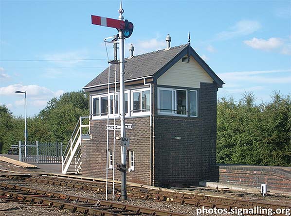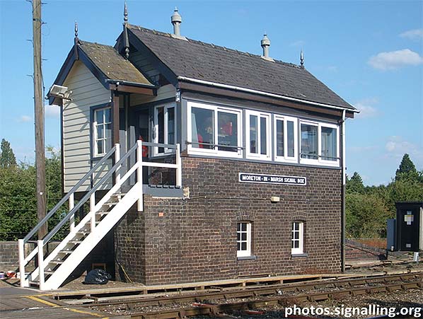 Photo by Edward, reproduced from Signalling Photos Archive under creative commons licence ![]() Moreton-in-Marsh signal box, south end, seen in July 2008. It is coded “MM” as indicated by the signal number “MM 4”. At bottom right can be seen a section of what had been the east face of the island platform, the west face ending just before the signal box steps. Whether the east face was extended at some point in time or the west face was truncated circa 1883 to make room for the signal box is not known. Photo by ‘Edward’ and reused under Creative Commons Licence from the indicated source.