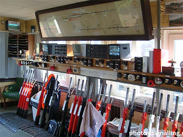 Photo by Edward, reproduced from Signalling Photos Archive under creative commons licence ![]() Part of the interior of Moreton-in-Marsh signal box seen in July 2008. The lever colours are Red – stop signals, Black – points, White – spare. Blue levers, not visible here, are for facing point locks. Like many surviving mechanical signal boxes the instrument shelf has a mix of the old and the new. Photo by ‘Edward’ and reused under Creative Commons Licence from the indicated source.