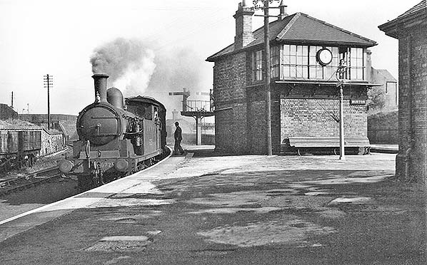 Photo from John Mann collection ![]() A class G5 0-4-4T carrying express passenger lamps was not a common sight but here we see one passing Murton piloting what appears to be a Peppercorn Class A2 Pacific. The train, or what can be seen of it, is wearing the early British Railways crimson and cream livery. Probably the train had been diverted onto this route, this being known to happen when the Durham Coast line was closed for engineering work or some other disruption. The G5 was likely acting as pilot to assist the train over the long and steep Seaton Bank, being detached at West Hartlepool before piloting another train north over Hesleden Bank. On the right a running-in board still stands but the platform lighting has been removed which tells us the station had closed to passengers by the time this photograph was taken. Class G5 began life as North Eastern Railway Class O and were purposeful, yet somewhat fussy little machines of which several became a common sight working Push & Pull trains. The final example was withdrawn in 1958, giving a date window of 1953 - 1958 for this photograph although the train wearing carmine and cream livery might suggest a little earlier than 1958. No G5 avoided the scrapyard but at the time of writing a 'new build' was under construction. Class A2 fared better with one, BR No. 60532 'Blue Peter' surviving into preservation.
