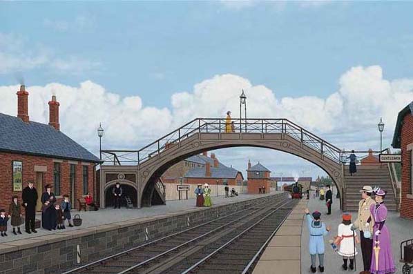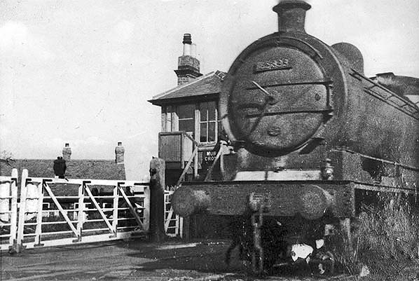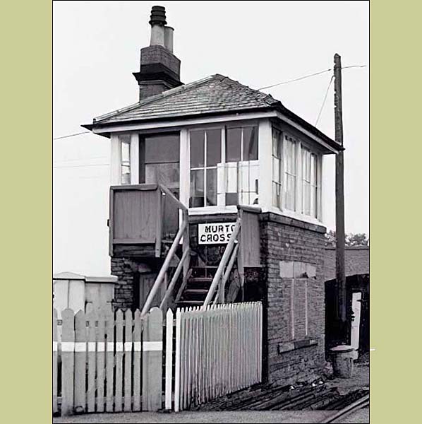 Painting by Joe McGinn ![]() Murton Crossing looking north with the station in the right background, about 1910. The gates are closed to the road yet all signals are at Danger, suggesting the scene was deliberately posed. It is unlikely a train has been halted at the signal protecting the crossing, behind the camera. The signal box, described elsewhere, is in its original external condition with nameplate on the front wall only and with the locking room windows still glazed. Just visible right of centre is the cattle dock, the small goods shed and the goods loading gauge. Among a myriad of wooden-post signals is one on a lattice post, right. This particular signal would in due course receive a wooden and rather lofty post, probably for sighting reasons, and would ultimately be a steel post signal with Home and Distant arms. The oil lamp to the right of the lattice signal was, although not immediately obvious in this view, one of several lining a path which ran behind the fencing to the station and stationmaster's house. On the west side of the level crossing, to the left in this view, was a fairly narrow lane laid with setts which led from the road to the main station building. Due to the presence of the Elvet branch this lane appears to have also been the only road vehicle access to the goods yard. The lane survived the demise of the railway and was partially restored in the early years of the 21st century. Right of centre, the bracket signal carrying three Shunt arms is mildly curious. The arm on the right controlled a short siding behind the platform which is thought to have been a locomotive bay. The centre signal appears to control 'wrong line' through the station while the left hand arm would have controlled a crossover giving access, via a reversal, to the Elvet branch or its associated siding. If this supposition is correct, then quite why such a facility was provided remains open to question.