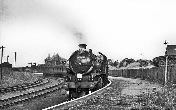 Photo from Murton Railway Station History Group ![]() What would appear to be a Class J39 0-6-0 takes the Durham Elvet branch as its crew receive the single line token from the signalman. The train is Empty Coaching Stock and will be returning to Elvet to collect passengers who had attended a Durham Miners' Gala. These trains ran one day per year, usually in July and there were several of them running from various locations in County Durham. Siding capacity at Elvet would have been inadequate for stabling all these trains so some would have to be stabled elsewhere during the day. The clock tells us it was 5.17PM. The name on the signal box states simply 'Murton' and the alternative name for both the 'box and station, 'Murton Junction', appears to have only ever been unofficial although it may have appeared on the diagram inside the 'box. The locomotive's number is illegible but manipulation of the image does reveal it is carrying a shedplate on its smokebox door. From this we can date the photograph to a July between 1950 and 1953 which is quite broad but does provide us with a period. See the second, closer, view of this train below.