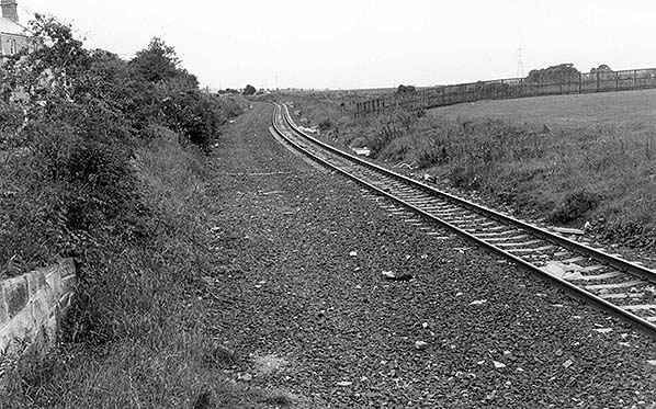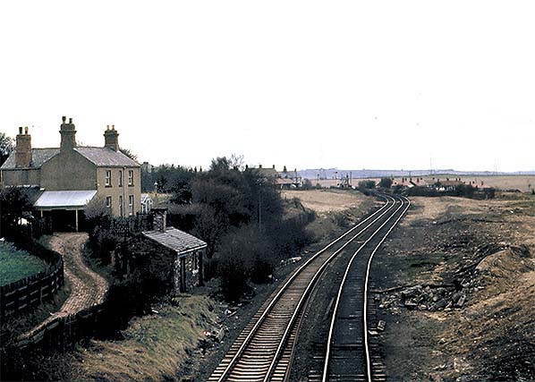Photo from Murton Railway Station History Group ![]() A south facing view taken from Murton Bridge and at Murton Crossing signal box in April 1979; signals protecting the level crossing can be seen in the distance. The southbound track has received some maintenance with a length of flat bottom rail on concrete sleepers being installed - this was the track which remained in use post 1984 when single line working was introduced. The northbound platform building which had survived closure of the station has by now been demolished. The other surviving building, seen here to the left, probably began life as a lamp room and perhaps also, given the two doorways, a coal store. No doubt it latterly served as a platelayers hut. In the left background stands the former stationmaster's house. As with the railway workers cottages, housing for stationmasters did not come free and a small rent was deducted from wages. Today the stationmaster's house is the only surviving former railway building in the immediate vicinity of Murton station. The cleared land of the right is the site of the junction with the line to Durham Elvet diverging to the right.