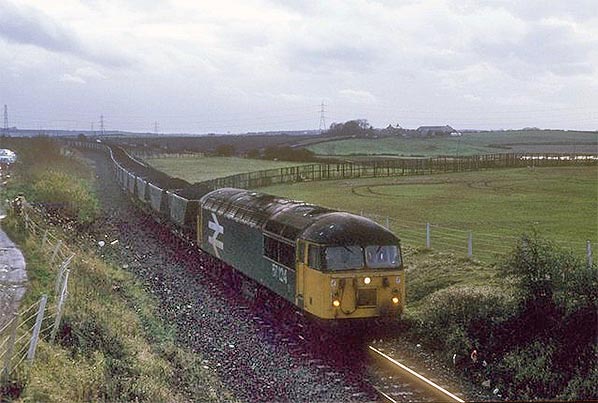 Photo by John Mann ![]() Just before dusk on 19 November 1992 a Class 56, which appears to be No. 56104, passes the site of Murton station on the by then single track line with a loaded coal train. Hawthorn Combined Mine, which incorporated Murton Colliery, had closed on 29 November 1991 but coal stockpiles still had to be removed and this train was on just such a duty. At this time the rapid loader at Hawthorn was still operational, but a number of mine buildings had been demolished. Sunderland South Dock crews were still working these trains as they had been doing for many years. The track curvature is a giveaway to the location as are the pylons in the background and the farm buildings at right centre background