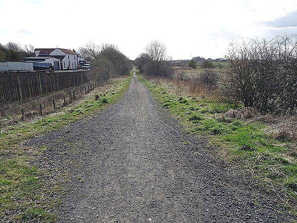 Photo by Roger Geach reproduced from Geograph under creative commons licence ![]() This view dates from 19 March 2020 and is looking south from the site of Murton Bridge. There is no evidence, at least not from this vantage point, that Murton station, which was directly ahead of the camera, ever existed. The much altered former stationmaster's house stands on the left. Following dismantling of the line the deck, if not also the abutments, Murton Bridge was removed and the cutting infilled either side of the former bridge to provide access ramps to and from the trackbed. We are looking at the south side ramp in this view and therefore the trackbed at this point is now several feet below the surface. The trackbed emerges in the distance, between the trees.