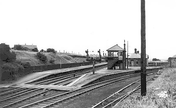 Photo from Murton Railway Station History Group ![]() This is one of several views showing similar desolate scenes during the time after the platforms had been cut back to leave just an intact stub at the north end but not taken at the same time. On the left is the northbound (Down) platform building and beyond it the bufferstops of three of the four goods yard sidings. Murton closed to goods, therefore entirely, on 13 June 1960 and the signal box seen here closed in May 1964. Signal boxes between Ryhope and Heswall closed at widely varying times and by 1984 only Murton and Seaton Station (there had been another 'box at Seaton Bank Top) remained. Both closed in May 1984 by which time they had been converted to IFS (Individual Function Switch)