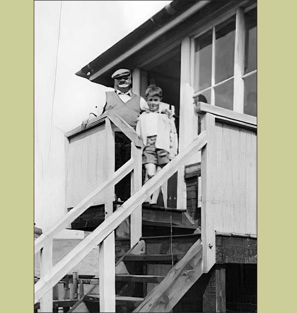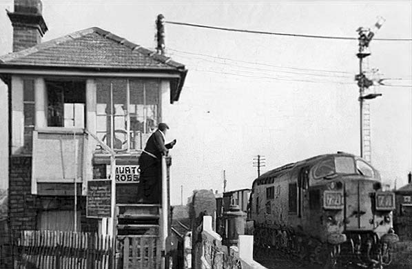 ![]() The steps of Murton Crossing signal box with the signalman and a young boy, perhaps a future railwayman, posing for the camera. Judging by the clothing, this view dates from sometime in the 1950s. The signalman has a badge on his cap but unfortunately the drawback of digitised photographs, it being the inability to zoom in without losing focus, prevents identification of the badge. The level crossing was out of view to the left.