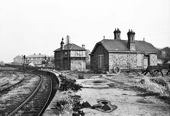 Photo from John Mann collection ![]() If the piles of permanent way and point rodding materials are anything to go by, this scene of desolation likely dates from early 1964, shortly before the remaining track of the former Durham Elvet branch, left, was lifted and the signal box closed. To the right can be seen the bufferstops of the goods yard sidings, closed in 1960, and the by now largely bricked-up former waiting room for the Durham line. Partly visible peeping out behind the left hand end of the building is the bay-windowed extension. The building's final use was probably as a store. The original signal box had stood dead ahead and roughly between the waiting room and this, the second signal box. One signal is 'off', indicating a northbound train is about to pass through. The white diamond on the signal indicates the presence of track circuiting on the track to which the signal applies. More properly it means 'Rule 55 does not apply' (information about Rule 55 is available online). Behind the signals can be seen what was latterly a platelayers hut although this is unlikely to have been its original purpose which may have been a lamp