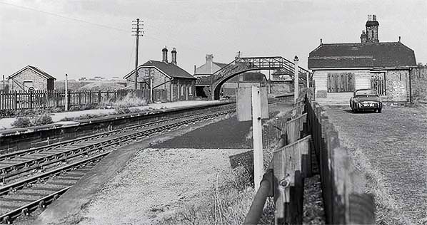 ![]() Very obviously taken some time after closure to passengers, this view faces north. The footbridge is by now in skeletal form, it having lost its ornate panels some years previously. The motor car, a Triumph TR3 which may have belonged to the photographer, is parked on the lane which led up from Murton Crossing and also gave access to the stationmaster's house, out of view. Point rodding is still in situ which means a pre 1964 date. At left can be seen Murton's small goods yard and shed along with the hand-operated crane, which latter was probably of 1½ ton capacity. The 1956 Handbook of Stations states by that year Murton was open to siding traffic only and with no mention of a crane, meaning the goods shed and crane were by that time out of use. Murton finally closed to goods and therefore all traffic in June 1960. Goods yard cranes had a habit of lingering, unless they were required for reuse elsewhere long after their services ceased to be required, so the presence of the crane in this view is of little use for dating purposes. Murton goods shed was quite diminutive and was served by a siding running along its east side, on the shed's right in this view. There would have been a platform inside the shed but whether there was an internal crane, which was the usual provision, is not known but the proximity of the yard crane to the shed suggests not. There was a doorway, visible here, giving access to the crane directly from the shed.