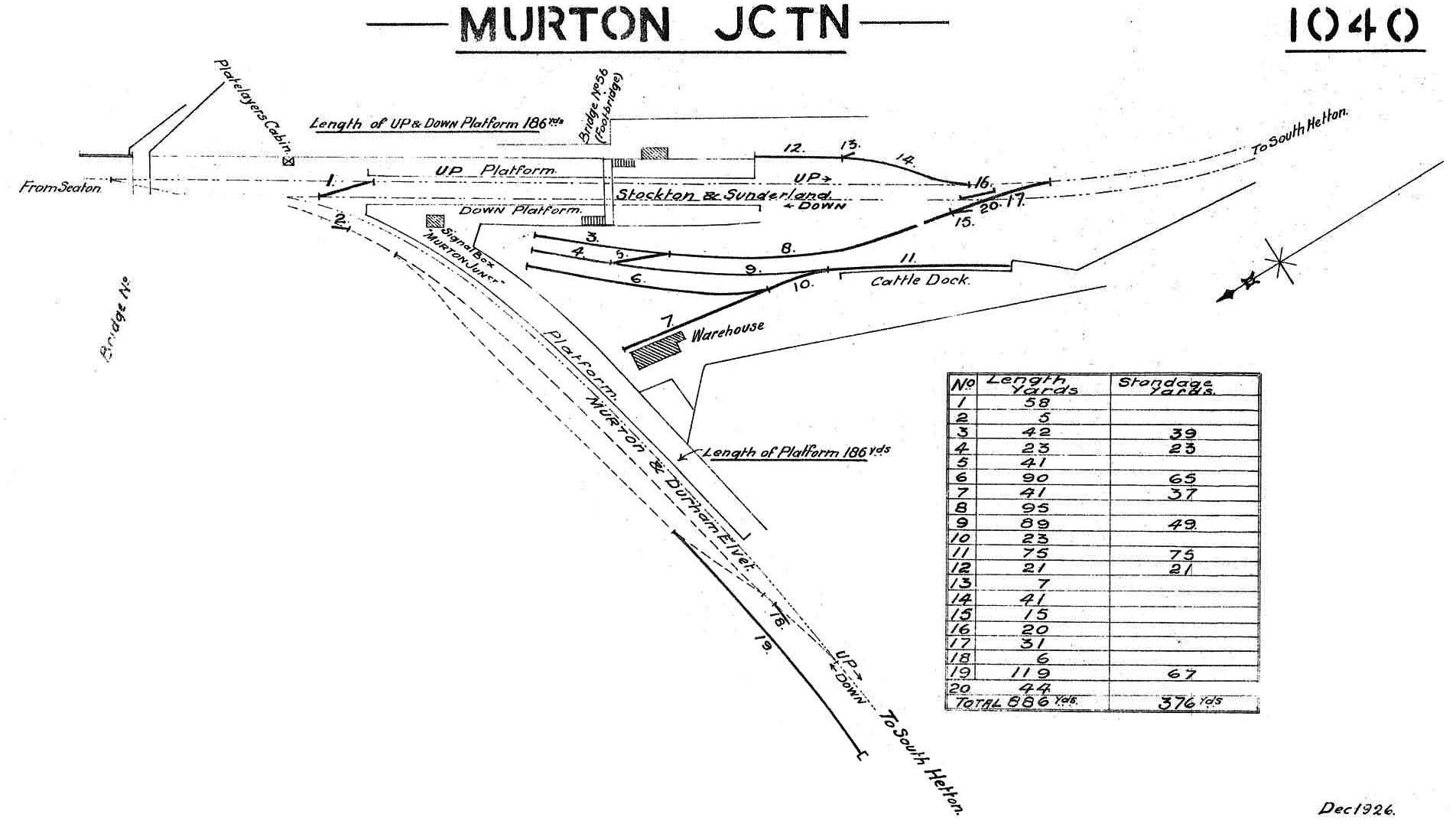 ![]() Layout of Murton station and goods yard in 1926. The lengths of the three platforms are shown; the two main line platforms and the Elvet platform are all 186 yards. Siding lengths are also shown with a total length of 886 yards. For some reason the goods shed is shown as a warehouse which is usually an American term. Note a reversal is required to reach both the goods shed and the cattle dock.
