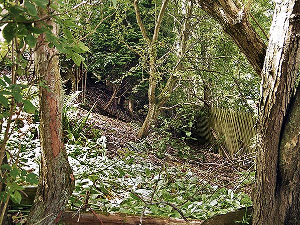 The scant remains of the footpath from the road to the up platform of Norham station looking west in June 2017. Some brick foundations of the former up platform waiting shed can be glimpsed, upper left.