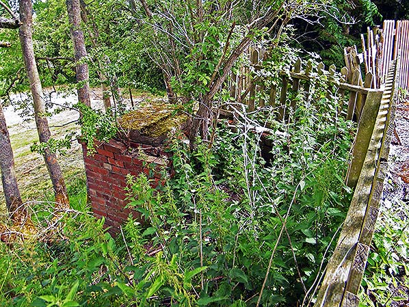 Part of the brick base that supported the timber waiting shed is seen from the up platform of Norham station in June 2017.