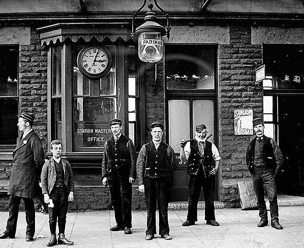 ![]() Station Name: PADIHAM![]() Station staff stand in front of the station master's office on the down platform at Padiham station in the first decade of the 20th century. The station master's office bay window contains the platform clock; it shows four minutes past three. A large glass domed lamp hangs from the building's awning and has the station name on the glass. An advert for Sunlight soap hangs from the wall of the building. The clock in the station master's office window was made by John Agar, at the time working out of Bury, Lancashire. He supplied many clocks and pocket watches to the L&Y railway company.