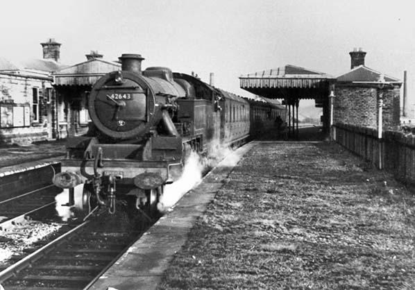 Photo from John Mann collection ![]() 4P-E 42643 stands at the up platform circa 1956 on its way along the loop line to Great Harwood and Blackburn. Many of these local services terminated at Blackburn. Note the typical combination of tank engine and three carriages. The view is from the Blackburn end. The station is now beginning to look uncared for and would close the following year.