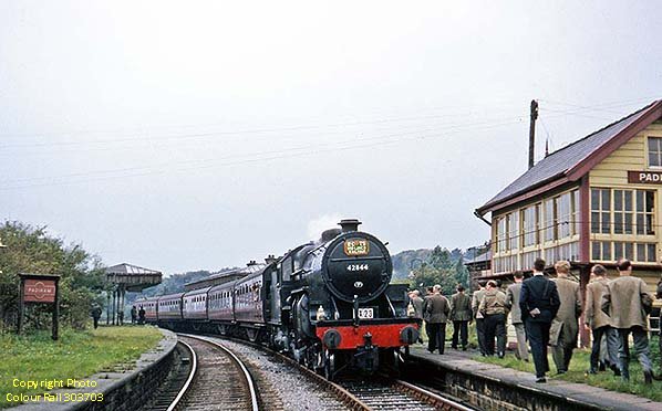 ![]() 22 September 1962, the RCTS Mid Lancs Railtour 1X23 pulled by a Hughes Crab 42844 stands at Padiham's down platform next to the signal box, with 5 carriages. This photo was taken from the Rose Grove end looking west. The tour came from the Blackburn direction and travelled the length of the loop line. Near the bottom left of the photo, on the up platform the LMS Hawkseye station name sign can been seen. The station was given the new BR signs in 1957 but for some reason they were never installed. Some of the passengers are having a stroll around the station and 4 people have made it onto the up platform. Most of the two platform areas are covered with grass as nature starts to take over. To the left of the signal box, the first floor of the ground level building can be seen. This first floor was the station manager's house with a connection from the front door (which faced the down platform) to a gate that led directly onto the platform.