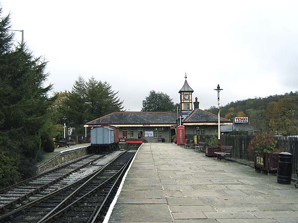 ![]() Looking northeast at Rawtenstall station in October 2010. The platform to the left is the remaining section of the down (to Bacup) platform. The station building was constructed in 1991 in the style of an ELR station. It sits accross the original trackbed.