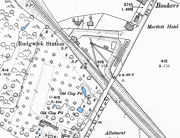 1898 1:2,500 OS map. The goods yard has an unsuual layout. One siding runs behind the platform while two sidings are accessed using a turnplate.