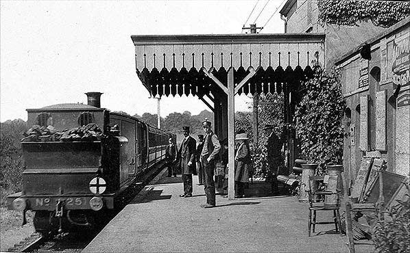 A posed Edwardian photo of Rudgwick showing a tall slim station master, probably Mr Louis Brighty, 1903-7. The Loco is LB&SCR D1 class Singleton. She was built by Neilson & Co, Glasgow in December 1881. She was later renumbered B251 and withdrawn from service in April 1926.