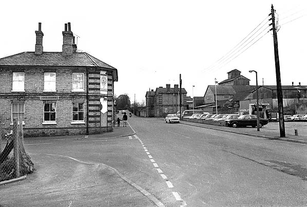 The Railway Arms pub at the junction of Station Street and Station Road in 1975. This and the station are the only old buildings now still standing. The station is seen in the distance