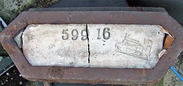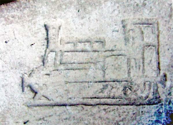 A close-up of the locomotive 'logo'. Although obviously very whimsical, there is some resemblance to the small tank locomotives of the Victorian era and not least the so-called 'coffee pot' locomotives of the Great Eastern Railway (later LNER/BR Class Y5). The 'logo' and number 599 16 will have been impressed onto the mortar with some sort of die or stamp probably engraved in wood. If so, there must have been more than one so-adorned brick and others may still exist hidden away somewhere. As previously, if anybody can provide further information we would be most grateful.