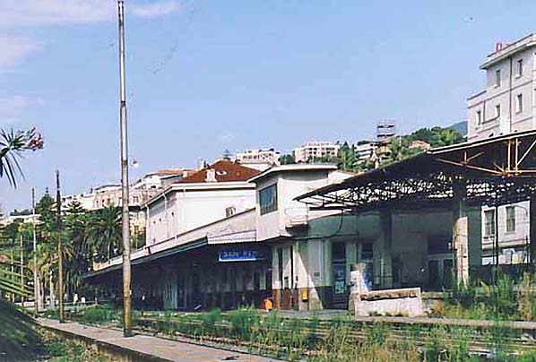 Photo by Aleksandar Salatic ![]() The station buildings at San Remo in July 2002, nine months after closure. The track bed is overgrown but the track is still in place. The overhead power lines have been removed. The station goods facilities are seen on the right.
