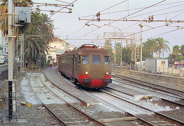 ![]() Photo by Giorgio Stagni ![]() Against a typical backdrop of Liguria's Mediterranean coast, E636 Class locomotive No. 072 waits with a train heading towards Ventimiglia. Note the lowered, ramped, section of platform to accommodate the crossing. There were one or two examples of this in Britain but on continental railways with lower platforms it was more common. The FS 636 Class locomotives were a Bo-Bo-Bo articulated design deemed suitable for certain of Italy's more tortuous routes. The two units making up the locomotives were, externally at least, identical and each only had a cab door on the right side which gave one cab door per side of the complete locomotive. The aesthetics of the design may not have been to everybody's taste, perhaps not helped by the reddish-brown livery. In later years other liveries were applied which considerably improved the aesthetics. The E636 Class originated during the Second World War, 1940 to be precise, and built in batches until 1962 resulting in a fleet strength of 469. No. 072 was one of the original wartime batch. From the technical aspect they were very simple locomotives, which may account for the fact the last examples were not withdrawn from service until 2006. The Bo-Bo-Bo arrangement was perpetuated with later classes, of which some remained in service at the time of writing.