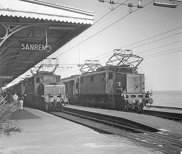 ![]() Station Name: SAN REMO (Italy)![]() Photo by Nick Catford ![]() Vintage electric locomotives beside the sea at San Remo in 1966. On the left is 431 Class No. E431.031 with another, unidentified, locomotive coupled behind it, while on the right is 432 Class No. E432.002. Introduced in 1922 and 1928 respectively, both classes had a 1-D-1 wheel arrangement (equating to 2-8-2 in steam locomotive terms). Electric locomotives of this era were very different to those of today in several ways. For example Classes 431/2 made use of 'liquid rheostats', comprising a solution of water and sodium carbonate plus a fresh water tank for cooling purposes. As such, these locomotives were well known for emitting steam, via a vent which is visible on top of No. E432.002's nose end. From time to time the water had to be topped up, providing the odd sight of an electric locomotive at a water column. Very obvious are the twin overhead wires with twin contact strips on the pantographs, the reason being the supply: 3,600VAC three-phase at 16 2/3 cycles (Hz). These locomotives were originally fitted with trolley poles with skate devices which probably proved unsatisfactory at speed. Today FS (Ferrovia dello Stato - Italian State Railways) uses 3,000VDC for its conventional lines and 25kV AC for its high speed lines. The three-phase system, which was complex, was gradually phased out and the final pockets disappeared in 1976. Examples of both locomotive classes seen here have survived into preservation but 431.031 and 432.002 are not among them.