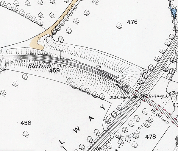 1922 1:2,500 OS map shows a few changes. A cattle pen is now shown at the end of the siding and the steps to the down platform have been replaced by a footpath running diagonally up the embankment.